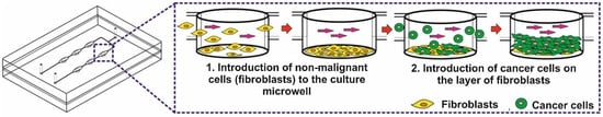 A fibroblast suspension was prepared and introduced into the microsystem via a peristaltic pump at a flow rate of 10 µL/min. The regular cell distribution in the microchambers was monitored with an inverted microscope. Non-malignant cells in the microsystem were incubated for 24 h (37 °C, 5% CO2). Once the fibroblasts adhered to the substrate, a cancer cell suspension was prepared. Breast cancer cells were introduced directly onto the layer made of non-malignant cells (flow rate = 10 µL/min) (Figure 2). Some of the cancer cells adhered to the substrate, and some to the layer of non-malignant cells. In this way, a multilayer cell culture was obtained in the microsystem. In the following days of culture, the proliferation and changes in the morphology of the cells in the microsystem were monitored. The medium was changed every 24 h (max. flow rate = 2 µL/min). The obtained cell multilayers were fluorescently stained and imaged using confocal microscopy to confirm the uniform and reproducible cell distribution in all culture microwells in the microsystem. The imaging results are presented in the Supplementary Materials (Figure S2).