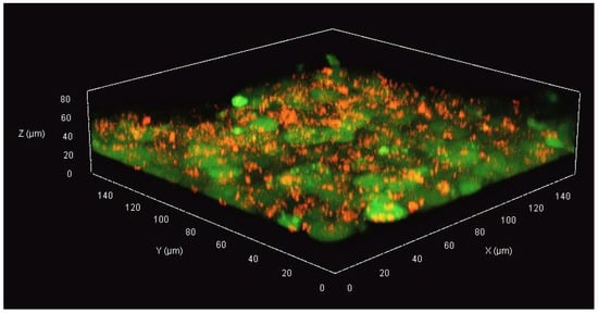 The microscopic images confirm that a spatial culture (3D) was formed in the microsystem after 96 h of culture. The culture was multilayered, and the thickness of the cell layers was about 40 µm (Figure 3). Imaging using confocal microscopy confirmed that the red-stained breast fibroblasts had reorganized and did not form a homogeneous monolayer on the fourth day of culture. Some of the fibroblasts moved between the cancer cells, which brought the construction of the developed cell model closer to the construction of cancer tissue.