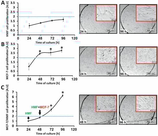 Analysis of the proliferation of non-malignant (HMF) and cancer (MCF-7) breast cells in the microsystem. The intensity of proliferation of (A) HMF and (B) MCF-7 cell monocultures. (C) The intensity of proliferation of co-cultures of HMF and MCF-7 cells (cell multilayer). The images show changes in cell morphology on the first (24 h or 48 h) and last (96 h) day of culture. The blue line marks the doubling of the number of cells in the population (2 times stronger signal). Asterisks indicate data that differ statistically from the control (24 h). The red frames in the microscopic images are close-ups of the cell morphology in the central area of the chamber.