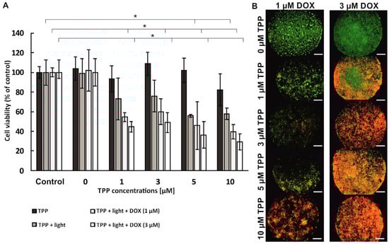 After chemotherapy with 1 µM of DOX, followed by PDT, no decrease in cell viability was observed in the co-culture of MCF-7 and HMF cells. For all concentrations of photosensitizer, cell viability in the multilayer was about 100% both before and after the irradiation step (Figure 7A). The use of a higher concentration of the cytostatic (3 µM) followed by the PDT procedure caused a decrease in the viability of breast cells. The viability of breast cells in the multilayer, independently from the tested TPP concentration, was approximately 70% (Figure 7A). The observed decrease in the viability of breast cells was similar to the effect of monochemotherapy, which was performed with the same DOX concentration in the macroscale (Supplementary Materials, Figure S3). Therefore, we supposed that the decrease in viability did not result from the use of photochemotherapy, but only from the toxic effect of the cytostatic. After staining of the cells in the microsystem with PI/CAM, a large number of alive cells was observed (Figure 7B). Differential staining confirmed the high viability of co-cultured non-malignant and cancer breast cells after the combined photochemotherapy procedure in the DOX→PDT sequence.