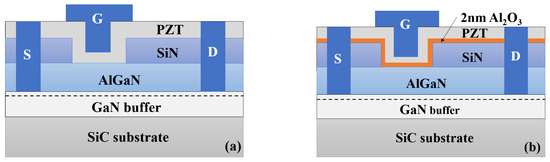 Schematic cross-section of (a) the PZT/AlGaN/GaN HEMT and (b) the PZT/Al2O3/AlGaN/GaN HEMT.