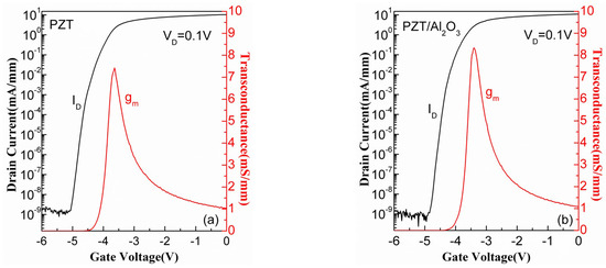 Transfer characteristic of (a) the PZT/AlGaN/GaN HEMT and (b) the PZT/Al2O3/AlGaN/GaN HEMT at VD = 0.1 V.