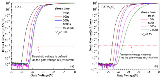 The ID-VGS curves of (a) the PZT/AlGaN/GaN HEMT and (b) the PZT/Al2O3/AlGaN/GaN HEMT after positive gate bias stress with different stress time.