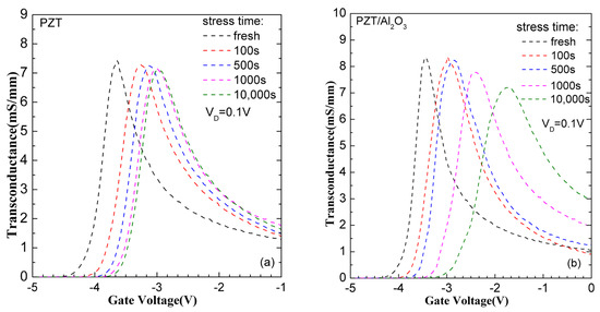 Transconductance curves of (a) the PZT/AlGaN/GaN HEMT and (b) the PZT/Al2O3/AlGaN/GaN HEMT after positive gate bias stress with different stress time.