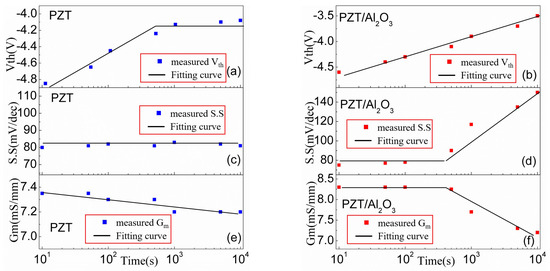 Stress time evolution of Vth, S.S, and gm of (a,c,e) the PZT/AlGaN/GaN HEMT and (b,d,f) the PZT/Al2O3/AlGaN/GaN HEMT.