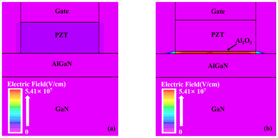 Electric field simulation of (a) the PZT/AlGaN/GaN HEMT and (b) the PZT/Al2O3/AlGaN/GaN HEMT at VG = 15 V.