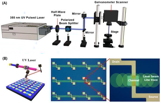 Schematic of (A) a laser annealing system using a 355 nm UV nanosecond pulsed laser and (B) the experimental procedure for laser annealing on a-IGZO TFTs. Multiple TFTs were scanned using the laser and the scanning direction of laser beam was perpendicular to the direction of the TFT channel.