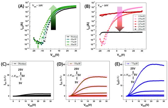 Transfer characteristics of a-IGZO TFTs after a 355 nm UV nanosecond pulsed laser annealing process (A) from pristine (no annealing) to 90 mW and (B) from 119 mW to 280 mW. Output characteristics of a-IGZO TFTs after the laser annealing process (C) pristine, (D) 55 mW, and (E) 77 mW.