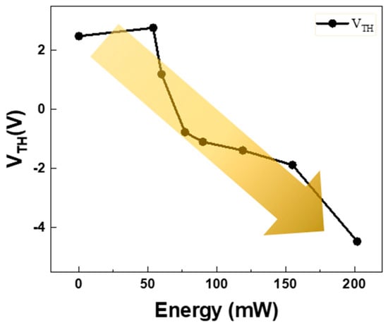 Table 2 also shows the dependence of the device parameters such as VTH, S.S., saturation mobility, and on/off current ratio (Ion/Ioff) on the laser annealing powers. As shown in Figure 2B, when the laser power was higher than 200 mW, a consistent off-current was generated, independent of the VGS value. This phenomenon was similarly observed in 308 nm XeCl excimer laser annealing, 248 nm KrF excimer laser annealing, and 800 nm femtosecond laser annealing of sputtered IGZO TFTs, as reported in references [,,]. The unstable electrical characteristics are expected to be attributed to device damage caused by excessive laser power and the generation of excessive carriers during laser annealing. Notably, smaller-sized TFTs tend to degrade more under laser annealing, as inferred from two-dimensional heat simulations of laser heating []. As the laser power was increased to 90 mW, the enhanced on-current may have affected Ion/Ioff, and the S.S. was also slightly improved. However, no clear correlation or dependence was observed between mobility and laser power. In the case of CO2 laser spiking annealing (LSA) of a-IGZO TFTs, identifying an optimized LSA condition to enhance saturation mobility is challenging, as mobility improvements do not consistently correlate with LSA parameters like peak temperatures and dwell time []. Figure 3 shows that VTH was slightly increased at 54 mW and exhibited a linear negative shift with increasing laser power. This behavior might be attributed to the limited capacity for the relaxation of structural defects. In contrast to conventional thermal annealing, the rapid timescale of laser annealing may not allow sufficient time to prevent ionization of oxygen vacancies and to compensate for laser-induced damage, as suggested in references [,].