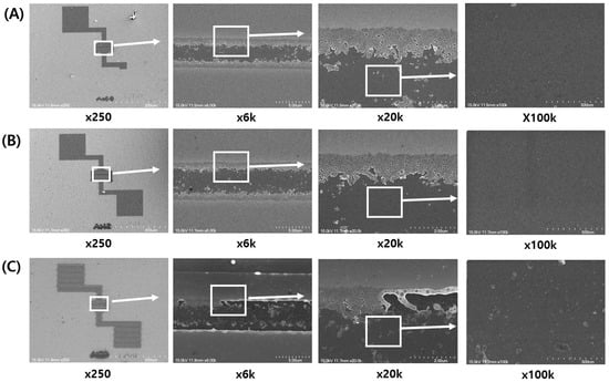 Scanning electron microscopy (SEM) images of a-IGZO TFTs after a 355 nm UV pulsed laser annealing process for the laser powers of (A) pristine (no annealing), (B) 77 mW, and (C) 227 mW. In case of the high energy of 227 mW, laser beam line traces are observed.