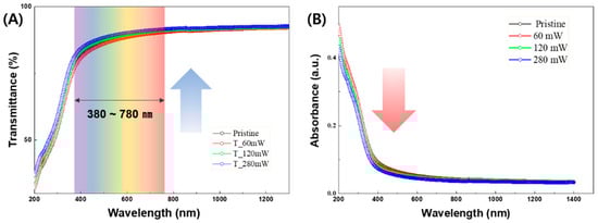 (A) Transmittance and (B) absorbance of a-IGZO thin films annealed using a 355 nm UV pulsed laser for laser powers of 0 (pristine), 60, 120, and 280 mW.