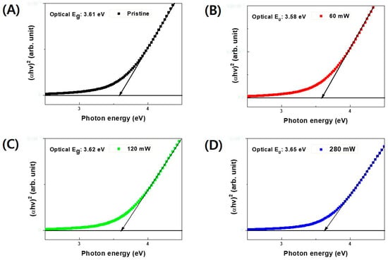 To further analyze the enhanced on-current and negative shift in VTH observed in the laser-annealed a-IGZO TFTs, the optical bandgaps of the laser-annealed a-IGZO layers were obtained by measuring their transmittance data. Figure 5A,B displays the transmittance data of the laser-annealed a-IGZO thin films and their corresponding absorbance, calculated using the logarithm of the reciprocal of the transmittance, respectively. For wavelengths exceeding 400 nm, all a-IGZO thin films exhibited transmittances higher than 80%. The average transmittances ranging from 380 to 780 nm were recorded as 87.54%, 87.18%, 88.45%, and 89.22% for laser powers of 0 (pristine), 60, 120, and 280 mW, respectively, indicating a slight increase in transmittance with rising laser power. Utilizing the absorbance data from Figure 5B and the known thicknesses of the a-IGZO films, the optical bandgaps of the laser-annealed layers were calculated using a Tauc plot, as presented in Figure 6. The determined optical bandgaps of a-IGZO were 3.61 eV, 3.58 eV, 3.62 eV, and 3.65 eV for laser powers of 0 (pristine), 60 mW, 120 mW, and 280 mW, respectively.