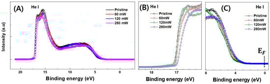 To determine the energy band structures of the laser-annealed a-IGZO layers, UPS spectra were measured for the laser-annealed a-IGZO thin films on silicon substrates, as shown in Figure 7A. The conditions for RF sputtering and laser annealing were consistent with those described in Figure 5 and Figure 6. The cutoff energy and VBMs were derived from the detailed views in Figure 7B,C, respectively [].