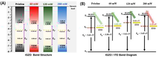 The junction between the ITO electrode and a-IGZO channel layers was described for different laser powers, as shown in Figure 8B. Assuming that the Fermi energy level of ITO is identical to that of a-IGZO, the energy barriers for electrons to move from ITO to the a-IGZO conduction band were calculated. These barriers were found to be 1.14 eV, 1.02 eV, 0.84 eV, and 1.13 eV for laser energies of 0 (pristine), 60 mW, 120 mW, and 280 mW, respectively. Therefore, the laser power of 120 mW was identified as the optimal level, as it minimized the distance between the Fermi level and the conduction band of a-IGZO. Consequently, this reduction in the energy barrier between the ITO electrode and the channel led to an increase in carrier concentration and on-current.
