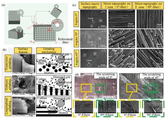 (a) Schematic diagram of the grinding direction and datum plane studied by Qu et al. [6]; (b) surface morphology and material removal mechanism of Cf/SiC in transverse, normal, and longitudinal direction by Zhang et al. [5]; (c) SEM of the ground surface in different fiber orientations; (d) surface morphology of 0°and 90° fiber bundles at different scribing directions by Liu et al. [10].
