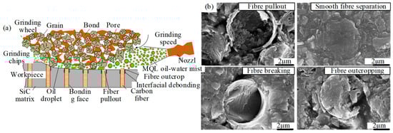 Due to the high hardness and low thermal conductivity of Cf/SiC composites, the grinding wheel absorbs and stores a lot of heat during dry grinding, resulting in the reduction of grain number, sharpness, and life. In addition, due to the passivation of the grinding wheel, the surface quality of the machined surface decreases [19]. Hu et al. [20] studied the cutting force, surface integrity, and machining defects in the milling process of 2D Cf/SiC composites with the commercialized PCD tool. The results showed that fiber fracture, matrix damage, and fiber-matrix debonding are the main types of material failure modes. Xu et al. [21] studied the dry cutting temperature of Cf/SiC with a straight-edge PCD tool. The study showed that the highest temperature reached around 732 °C, with a significant increase in cutting force, which makes the surface quality poor. Qu et al. [22] investigated the effect of minimum quantity lubrication (MQL) on the grinding performance of unidirectional carbon fiber-reinforced ceramic matrix composites, as shown in Figure 3a, which includes abrasive, lubricant, and material. The surface morphology was observed using scanning electron microscopy (in Figure 3b). The main fracture patterns of carbon fiber are smooth separation, fracture, detachment, and pulling out.