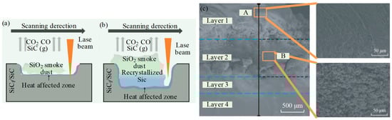 Zhang et al. [24] designed a single-factor experiment to understand the micro-structure evolution and ablation behaviors of the microgrooves processed by a picosecond laser. This study provided a theoretical basis and practice guidance for LAG of the SiCf/SiC composites. Figure 4a shows the amorphous SiO2 smoke, with extremely fine particles. The dust attached to the treated surface caused the occurrence of pileup, leading to a slight increase in Ra value along the machined microgrooves. When the laser parameters (pulse energy, repetition frequency, scanning times, and scanning speed) were adjusted to increase the microgroove depth, the SiC vapored in the subsurface layer was recrystallized during rapid cooling, as presented in Figure 4b. Compared to the ultrahigh hardness SiC fiber and SiC matrix, the SiO2 smoke dust or recrystallized SiC were powdery due to the ablation, which were easy to remove and were expected to greatly improve the surface quality. An et al. [25] analyzed the products of continuous laser ablating CMC, and the factors affecting the depth of ablation layer were analyzed. As shown in Figure 4c, according to the morphology and types of ablation products, the laser ablation of SiCf/SiC can be divided into the coagulated layer (Layer 1), the re-crystalized SiC layer (Layer 2), the heat-affected layer (Layer 3), and the non-affected layer (Layer 4). In Layer 1, gaseous SiC and oxygen in the air undergo an active oxidation reaction at high temperatures to form smoky amorphous SiO2 condensation deposited on the surface of the ablated layer. Layer 2 is mainly composed of re-crystalized SiC particles with a micro-size scale. A small amount of SiO2 soot is attached to the particles.