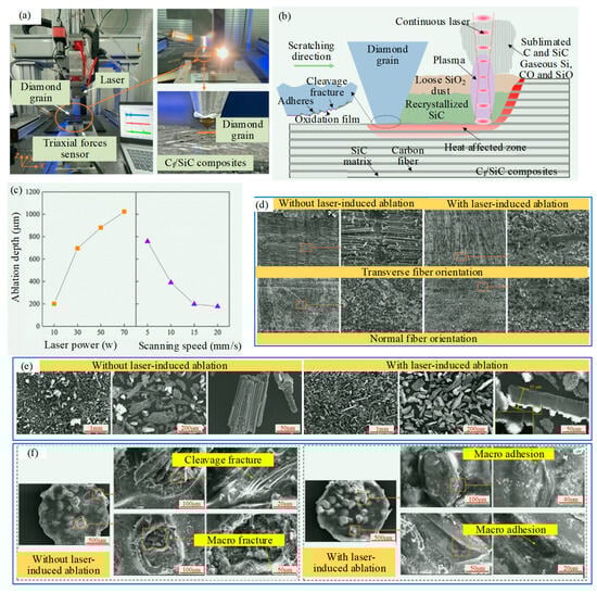 Laser-induced ablation-assisted grinding (LIAAG) by Zhou et al. [26]: (a) Laser-induced ablation-assisted grain scratching testing machine; (b) material removal mechanism of Cf/SiC composites during LIAAG; (c) temperature field and ablation depth during laser ablation; (d) SEM images of Cf/SiC composites surface after grinding: (e) SEM images of grinding chips; (f) wear morphology of diamond abrasive grains.