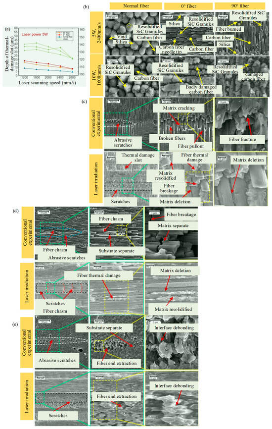 Laser-assisted grinding to improve the processing quality of 3D Cf/SiC composites: (a) Relationship between laser power, scanning speed and thermal-damage slot size; (b) micro-structure of fiber surface after laser irradiation; (c) microscopic profile of 0° fiber area scratches; (d) microscopic profile of 90° fiber area scratches; (e) microscopic profile of normal fiber area scratches.