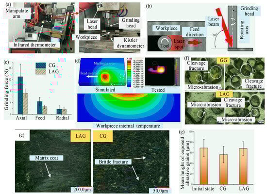 The cutting performance of CG and LAG of SiCf/SiC by Kong et al. [28]: (a) LAG system; (b) schematic diagram of LAG; (c) comparison of CG and LAG forces; (d) laser temperature field; (e) surface morphology; (f) grinding head abrasive grains wear forms; (g) mean heights of exposed abrasive grains.