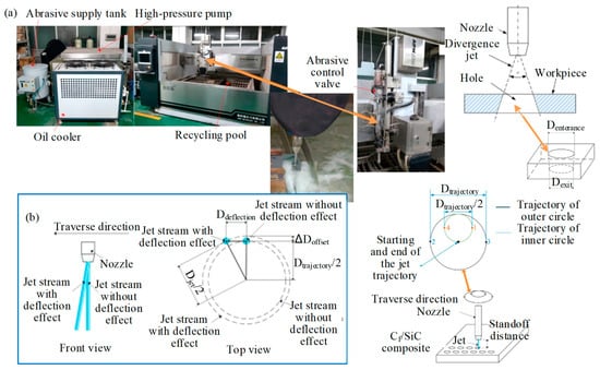 AWJM hole-making of Cf/SiC by Zhang et al. [33]: (a) Experimental setup and processing diagram of AWJM; (b) schematic diagram of deflection effect.