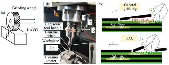 The experiment on UVAG of SiCf/SiC material by Kang et al. [37]: (a) a type of UVAG; (b) UVAG test platform; (c) schematic diagram of grinding removal process of SiCf/SiC composites.