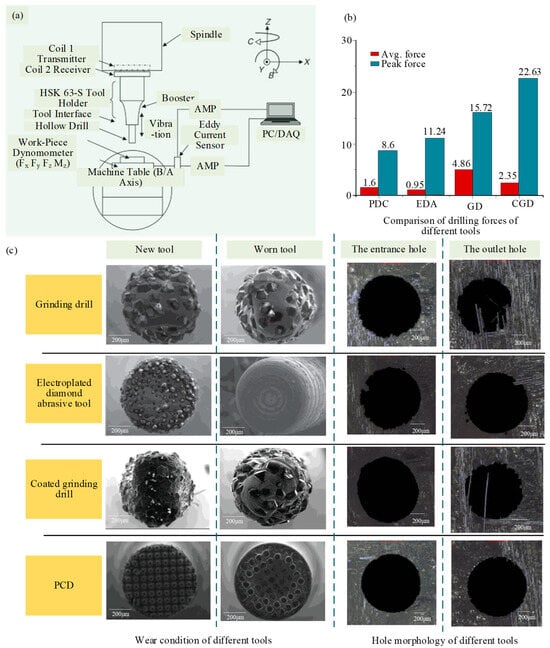 Different tools for micro-hole drilling of SiCf/SiC CMC assisted by ultrasonic vibration by Bertsche et al. [40] and Huang et al. [43]: (a) Experiment setup; (b) Comparison of drilling forces of different tools; (c) Hole morphology and wear condition of Different tools.