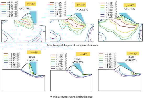 Liao et al. [49] simulated the single grain scribing process, as shown in Figure 11. The chip formation and temperature field distribution of negative rake angle were simulated by FEM. The results show that the chip formation can be explained by cutting theory when the negative front angle is −15°~−40°. However, it is more appropriate to apply the hardness indentation principle proposed by Shaw [50] to describe the large negative rake angle. The shear angle decreases and the shear strain increases with the increase of the negative rake angle. Meanwhile, in large negative rake angle grinding, the highest temperature appears at the contact point between the abrasive tip and the workpiece, which is higher than the small negative rake angle grinding temperature. With the increase of the negative rake angle of abrasive particles, the energy consumed in chip formation increases. Wu et al. [51], through FEM, concluded that, under wet grinding conditions, grinding fluid can reduce the wheel sliding force (tangential force), which can reduce the grinding zone temperature. Long et al. [52] simulated and analyzed the temperature field in the process of high-speed grinding of engineering ceramics by using the FEM. The result showed that there was a high-temperature gradient in the shallow surface, which would generate a large thermal tensile stress and lead to machining defects such as thermal cracks.