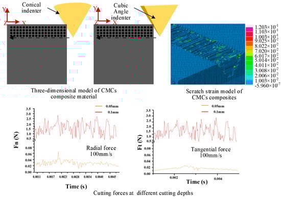 Zhang et al. [48] studied the mechanical properties of Cf/SiC composites and the influence of interface phase on mechanical properties by using a cohesion model and the Oliver–Pharr method. The interface strength and thickness influence on the load-displacement curve during nanoindentation was analyzed. It was found that, due to the presence of the interface, the in-situ mechanical properties of carbon fiber materials were changed. The hardness and elastic modulus of carbon fiber materials near the interface were increased. The maximum load, material hardness, and elastic modulus were positively correlated with the interface strength and interface thickness. The simulation provides a theoretical basis and research method for the study of grinding parameters and material removal mechanisms of Cf/SiC composites.