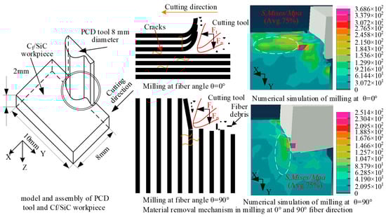 Fang et al. [53] established a multi-interface stress transfer simulation of CMC materials by FEM, through a unit-cell model. The shear stress and optimized interface stress propagation were studied. As shown in Figure 12, at the middle position plane of the interface phase, the shear stress rapidly increases to the maximum value near the forced spot. Then, a decrease along the fiber direction occurs and tends to zero about 2Rf away from the forced spot. The above trends of shear stress are the same under different interfacial thicknesses, with the increasing thickness of the interface phase. The maximum value of shear stress gradually decreases. The position reaching the maximum value is gradually far away from the forced spot. In the radial direction of fiber, the shear stress exhibits a rapid increase near the interface between the fiber and the interface phase, reaching its maximum value at the interface. For the PyC interface phase, the shear stress decreases along the radial direction. After crossing the interfacial phase and the interface, the shear stress continues to decrease in the matrix along the radial direction. Liu et al. [54] established a scratching simulation model of SiCf/SiC based on the JH-2 model in ABAQUS (in Figure 13). The magnitude of the scratching force under different scratching speeds, depths, and different diamond types was analyzed, as well as the influence of fiber orientation. Li et al. [55] established a two-dimensional simulation model of a single diamond grain scribing Cf/SiC in ABAQUS, and the influence of wheel speed and grinding depth on grinding force and workpiece surface morphology was analyzed. Ellahi et al. [56] analyzed the cutting performance of Cf/SiC with a PCD tool by the FEM. In Figure 14, the fracture modes in parallel and vertical to the fiber direction and the corresponding force distribution near the cutting edge were analyzed. At cutting angle θ = 0°, with respect to the fiber direction, and the machining direction parallel to the fiber direction, the material is removed mainly due to the debonding of fiber and matrix. Initially, the matrix fracture and crushing of carbon fibers occur near the cutting edge, and cracks propagate along the fiber direction. In the uncut chip area, the bonding of fibers and matrix becomes weak as the fiber axial strength is far stronger than the bonding strength of fibers and matrix. Stresses mostly occur at the tooltip and propagate along the fiber direction. At a 90° fiber angle, the rake face of the tool is perpendicular to the fiber direction and carbon fibers are subjected to tensile stresses. Initially, cracks occur ahead of the tooltip and move in the feed direction. The shear strength of fibers is lower than axial tensile strength. Therefore, when fibers are subjected to the tensile stress, fibers begin to elongate and eventually break as the force surpasses the fibers’ shear strength. The friction between the cutting tool and workpiece is maximum at that point and the material has been removed mainly due to the shearing of fiber bundles. Stresses are mostly distributed at the rake face of the cutting tool and the maximum stress is concentrated around the tool edge. This research provides an efficient way to analyze the cutting performance of Cf/SiC composite.