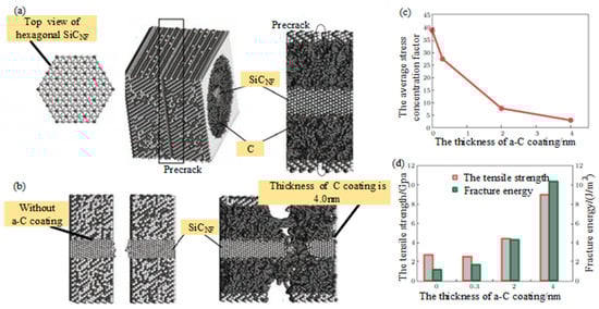 The effect of amorphous carbon interfacial layer thickness on the fracture mechanical behavior of SiCNF/SiC composites through MD calculations studied by Li et al. [68]: (a) Atomic configuration of SiCNF/SiC nanocomposite with predefect in matrix; (b) atomic configuration of fracture surface in SiCNF/SiC nanocomposite with C coating in different thickness; (c) the average stress concentration factor of SiCNF vs. the thickness of C coating; (d) the tensile strength and fracture energy of SiCNF/SiC nanocomposite as a function of the thickness of C coating.