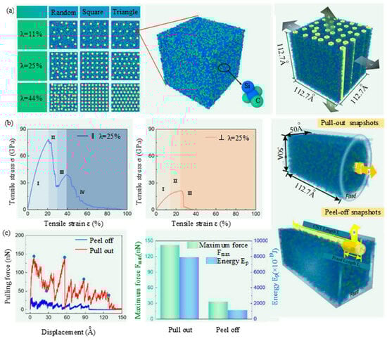 The tensile mechanical properties of vertically aligned CNTs/SiC nanocomposites (VSNs) through MD simulation by Miao et al. [69]: (a) Molecular models of VSNs with different carbon nanotubes (CNTs) distribution types and contents and tensile models of VSNs along ‖ and ⊥ directions; (b) tensile stress–strain curves and tensile snapshots with stress distribution along ‖ and ⊥ directions; (c) molecular models for pull-out and peel-off of CNTs from SiC matrix.