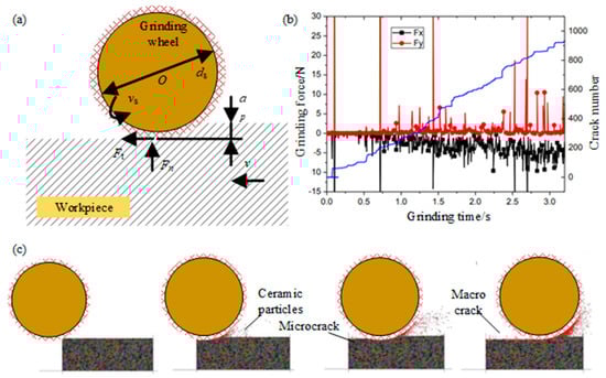Jiang et al. [71] simulated the grinding process of ceramics to understand the grinding mechanism, through building a two-dimensional particle flow program as a simulation platform. The process parameters used in the DEM model of the horizontal spindle plunge grinding process are shown in Figure 19a. The relationship among the grinding force and ground surface crack number with the grinding time is shown in Figure 19b, and the number of cracks and the average grinding force increase steadily with the increase of grinding time, and the grinding force of Fx increases faster than that of Fy due to the grinding chips filling the clearance of the grinding wheel. In addition, when the grinding force changes dramatically, the crack increases rapidly, resulting in the fracture of the ceramic parts. As shown by the red dot in Figure 19c, the grinding wheel moving forward, the crack growth, and the damage appear on the machining surface. Some micro-cracks can be found along the grinding track. The microcracks extend along the contact surface of the particles and form macroscopic cracks on the machined surface, resulting in the removal of the front-end material. It can be seen that the microcracks do not form obvious macroscopic intermediate cracks. The grains disintegrate into dispersed particles. In the grinding zone, most of the grains are crushed into particles, which are then quickly thrown away from the surface of the workpiece by the tangential force. Qiang et al. [72] established the DEM model of silicon carbide ceramics and the ultra-precision cutting model of the single point diamond. A dynamic simulation was carried out. The influence of the residual stress distribution on the direction of the workpiece depth under different cutting conditions, such as tool rake angle, cutting speed, and cutting depth, were analyzed. This study proved that a residual stress analysis is feasible with the DEM.