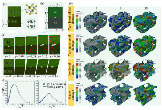 The hybrid of FEM-MD method by Wang et al. [74]: (a) MD simulation model of SiC/PyC interface; (b) load on MD simulation model; (c) damage evolution process of interface crack under pure tensile and shear load; (d) on the basis of MD simulation, the traction-separation laws (TSLs) for normal and tangential in interface; (e) damage evolution of 3D woven composite FEM model (Ⅰ: εZ = 0.03%; Ⅱ: εZ = 0.23%; Ⅲ: εZ = 0.75%).