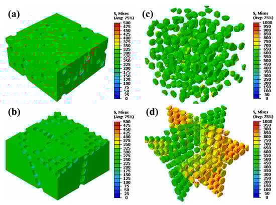 The accuracy of finite element modeling is essential for studying the machining mechanism of SiCp/Al composite materials. Chen et al. [] compared the cutting mechanism of SiCp/Al using uniformly distributed particles of the same size at the micro-level and randomly distributed non-equally sized particles. A uniform model of the same size can obtain good stress distribution and chip morphology. However, random models can more accurately simulate chip cutting, workpiece cutting force fluctuations, and workpiece surface damage. Chen et al. [] revealed the mechanism of chip formation in SiCp/Al6063 composite materials through a three-dimensional finite element end-milling model and an equivalent homogeneous material (EHM) model. The improved Johnson–Cook constitutive model based on strain gradient theory by Fan et al. [] effectively reflected the size effect of workpiece materials. Wang et al. [] studied the fracture and removal mechanism of SiC particles and their impact on surface formation, finding that the particle fragments squeezed by the cutting tool during the cutting process changed the mechanism of chip formation. Du et al. [] analyzed the removal modes of reinforced particles and Al matrix and their effects on surface formation mechanisms through the simulation of single diamond abrasive cutting. It is believed that when processing SiCp/Al composite materials, SiC is removed through methods, such as crushing, debonding, fracture, shearing, pulling in, and pulling out. Zhou et al. [] proposed a deformation mechanism and surface quality finite element model that accurately predicted metal matrix composites (MMCs). They found that serrated chips mainly form along the shear plane, accompanied by the generation and propagation of microcracks. Wang et al. [] discovered complex chip formation mechanisms through high-speed milling simulations, including matrix deformation and fracture, debonding between the matrix and SiC particles, and the potential fracture of some particles. Zhang et al. [] studied the existence of microcracks in the material preparation process based on composite fracture mechanics. Song et al. [,] obtained the following through simulation research: the fracture toughness and tensile ductility of composites decrease with the increase in the SiC particle volume fraction. As shown in Figure 3, Gao et al. [] compared composite materials with a network system structure and a homogeneous structure and found that SiC particle walls parallel to the external load direction have higher load-bearing capacity, while walls perpendicular to the load direction exhibit similar stresses to homogeneous composite materials.