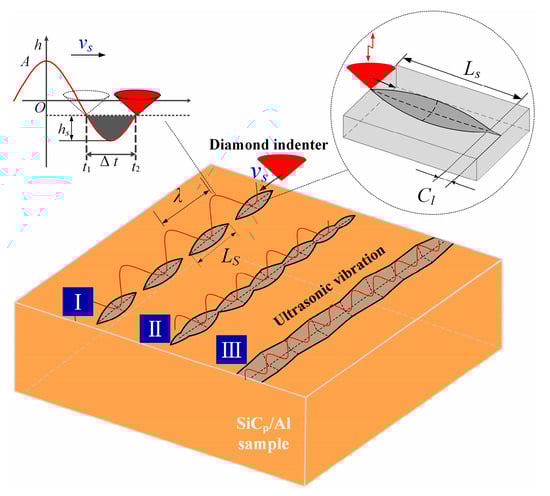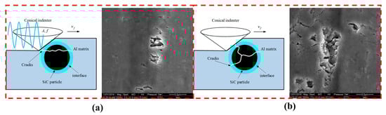 With the application of ultrasonic vibration-assisted processing technology, scholars have shown great interest in studying the material removal mechanism of this processing technology. Ultrasonic vibration-assisted scratching can achieve plastic removal of materials at large cutting depths, and increasing the ultrasonic amplitude can increase the material removal rate []. Furthermore, the scratching load and friction coefficient are relatively small, while the depth and width of the scratches are relatively large []. In their study on SiCp/Al composite materials, Zheng et al. [] found that the scratching profile surface was relatively smooth, and the edges were relatively intact. Surface defects mainly appeared as grooves caused by the fracture and breakage of SiC particles, rather than large pits caused by the complete removal of the entire particles. Additionally, due to the obstruction of SiC particles to the plastic flow of the aluminum matrix, microcracks may appear on the surface, and there are also many small SiC fragments in the chips. Therefore, the degree of SiC particle fragmentation determines the surface integrity, and a lower scratching speed will exacerbate the degree of SiC particle fragmentation, thus indirectly enhancing surface integrity []. Figure 4 illustrates the material removal modes of SiC particles in ultrasonic scratching (US) and traditional scratching (TS) tests.
