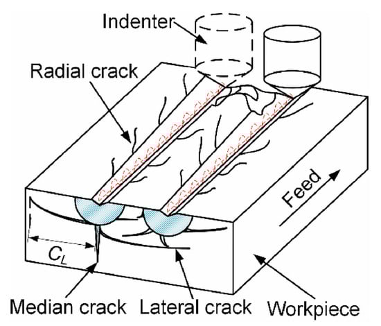 Li and his team [] conducted research on three types of scratch trajectories: continuous, semi-continuous, and intermittent (as shown in Figure 5). The study found that the trajectory pattern is influenced by the scratch speed, scratch depth, ultrasound amplitude, and frequency. The intermittent scratch pattern should be avoided in actual processing, while the continuous scratch pattern can achieve better surface integrity. Qiao et al. [] conducted a dual-scratch experiment with different scratch depths and spacing distances, as shown in Figure 6. Increasing the spacing distance leads to crack propagation, and ultrasound vibration helps promote the expansion of shallow transverse cracks and reduce the depth of crack damage.