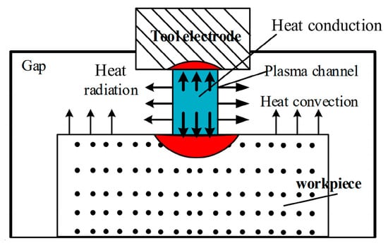 Seo et al. [] studied the machinability and processing quality of high-volume-fraction composite materials using EDM. They observed that the material removal rate increased with increasing peak current and pulse on time until reaching the optimal point, and then they sharply decreased. Liu et al. [] discovered that increasing the pulse width initially decreased and then increased the temperature in the workpiece during the ablation process of single-pulse electrical discharge machining. Furthermore, they observed that the temperature increased with the increase in peak current. Appropriately reducing the current would be beneficial for efficient discharge during the treatment process. Figure 9 illustrates a schematic diagram of EDM.