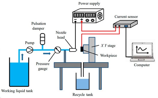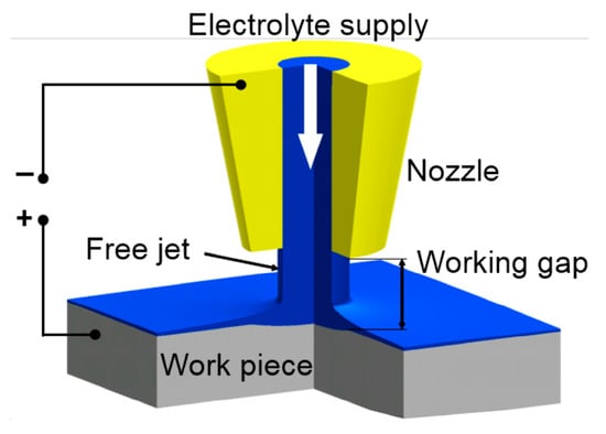 In addition to electrical discharge machining, numerous scholars have also conducted studies on electrochemical jet machining. Norbert et al. [] utilized three pH-neutral water electrolytes—sodium bromide, sodium chloride, and sodium nitrate—to perform electrochemical jet machining on SiCp/Al. The principle can be seen in Figure 10. The dissolution characteristics vary depending on the electrolyte utilized. The deepest point erosion is achieved by using NaCl as the electrolyte, followed by NaBr, while the shallowest erosion is obtained with NaNO3 or sodium bromide. Moreover, the width of point erosion primarily relies on the diameter of the nozzle employed. Therefore, the achievable width ranges from 2- to 3-times the nozzle diameter. The applied voltage and processing time are the main factors that control the size of point corrosion. The influence of particle fraction on depth and width is relatively minor.