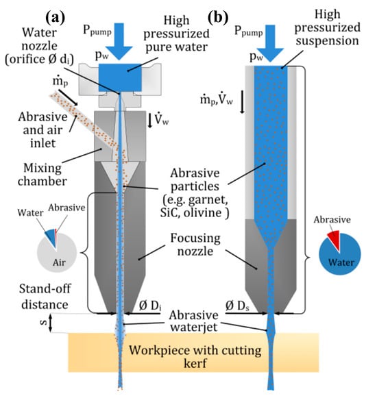 The abrasive water jet (AWJ) is a unique “cold” machining process that utilizes a high-pressure, high-flow rate water jet, as well as an abrasive slurry, to process target materials. It offers several advantages, such as no thermal deformation, low cutting force, and strong versatility []. The mechanism of the AWJ involves introducing abrasive particles, typically garnet, into a high-pressure, high-speed water flow. This allows the water’s momentum to transfer to the abrasive particles, resulting in the acceleration of numerous abrasive particles. Consequently, these particles mix with the water and form a high-speed jet that is directed towards the target material for erosion cutting []. The AWJ process can be divided into two types, depending on the method used for jet generation: the abrasive injection jet (three-phase—air, abrasive, water) and the abrasive suspension jet (two-phase—abrasive, water). The device schematic diagrams can be seen in Figure 13 []. However, due to its high operational difficulty, the suspended jet technology has yet to be widely implemented in the industry.