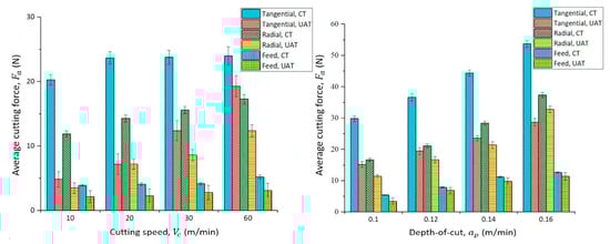 In the process of ultrasonic vibration-assisted machining, ultrasonic vibration not only enhances the Al matrix and exhibits good resistance to adhesion but also induces the fracture of SiC particles []. This reduces the occurrence of SiC particles being pulled out from the surface and forming pits [], as well as the occurrence of edge fracture [], thereby improving the surface quality of the machined material. Kim et al. [] conducted a series of comparative turning experiments using two sizes of SiC particle-reinforced aluminum matrix composites (217XG, 225XE) and concluded that compared to conventional turning (CT), ultrasonic vibration-assisted turning (UAT) resulted in decreases of 60.5% and 29.5% in the average tangential cutting force for 217XG and 225XE, respectively. Furthermore, the surface roughness increased by 33% and 52.5% for 217XG and 225XE, respectively, as shown in Figure 14. Gao et al. [] verified that the ultrasonic vibration milling of SiCp/Al can improve surface integrity and tool life. The machined surface of ultrasonic vibration-assisted end grinding is characterized by peaks and troughs, with the surface finish being nearly isotropic []. Das believes that ultrasonic-assisted grinding (UAG) helps in removing material through ductile modes and achieving high surface quality. Both rotary ultrasonic end-face grinding experiments [] and rotary ultrasonic side grinding experiments [] have proven this. By using a diamond grinding tool with a smaller diameter and a relatively low-speed ratio, an optimal integrated surface can be obtained []. Additionally, in order to better compare the cutting forces generated by ultrasonic vibration-assisted machining technology with conventional machining processes, Zhou et al. [] proposed a mechanical model for predicting the grinding forces of SiCp/Al composite materials in ultrasonic vibration-assisted grinding.
