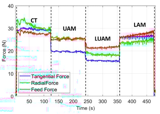 Traditional machining methods exhibit bottlenecks in improving machining performance, such as severe tool wear and poor surface integrity []. With the demand for high-dimensional accuracy, high efficiency, and low damage of composite materials, currently, the processing methods applied to hard and brittle materials mainly rely on ultrasonic-assisted processing technology []. These include ultrasonically assisted turning, ultrasonic-assisted milling [,,], ultrasonic-assisted drilling, and ultrasonic-assisted grinding [,]. In this technology, additional excitation vibrations with ultrasonic frequency and amplitude are applied to the tool or workpiece. Its characteristic is that the tool or workpiece undergoes multiple separations and contacts during the machining process to change its material removal mechanism []. The UAM process has been proven to reduce cutting force and improve tool life when machining very hard and brittle materials [].