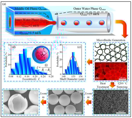 Schematic illustration of the microfluidics-based hollow silica microsphere fabrication process. (a) Schematic diagram of the microfluidic system. (b) The optical and fluorescence images of the as-prepared W1/O/W2 double-emulsion droplets; the scale bar is 200 µm. (c) Statistical analysis of the shell diameter of the as-prepared W1/O/W2 double-emulsion droplets. (d) Statistical analysis of the eccentricity of the as-prepared W1/O/W2 double-emulsion droplets. (e,f) SEM images of the as-prepared hollow silica microspheres based on microfluidics. The scale bars are 500 µm and 25 µm, respectively. (g) SEM image of an artificially crushed hollow silica microsphere. The scale bar is 15 µm.