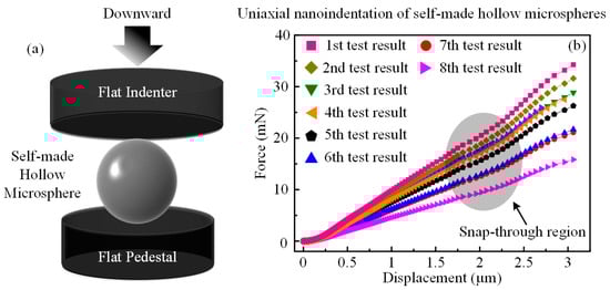 (a) Schematic representation of the uniaxial nanoindentation test setup equipped with a flat indenter. (b) Nanoindentation results of hollow silica microspheres derived from the microfluidic W1/O/W2 double-emulsion droplets.