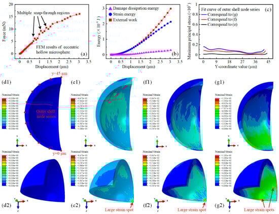 Finite element simulation results of eccentric hollow microsphere nanoindentation with prescribed displacement. (a) Force-displacement behavior of the eccentric hollow microsphere during uniaxial indentation simulation. (b) The variation of external energy input, strain energy, and damage dissipation energy of the eccentric hollow microsphere during uniaxial indentation simulation. (c) The numerical fit curve of the maximum principal stress distributed in the outer shell of the eccentric hollow microsphere with respect to the y coordinates at varying displacements. (d–g) The nominal strain distribution of the eccentric hollow microsphere during uniaxial indentation simulation. (d1,d2) The nominal strain distribution contour of the eccentric hollow microsphere from two different perspectives in the initial configuration. (e1,e2) The nominal strain distribution contour of the eccentric hollow microsphere from two different perspectives at a displacement of 1 µm. (f1,f2) The nominal strain distribution contour of the eccentric hollow microsphere from two different perspectives at a displacement of 2 µm. (g1,g2) The nominal strain distribution contour of the eccentric hollow microsphere from two different perspectives at a displacement of 3 µm.