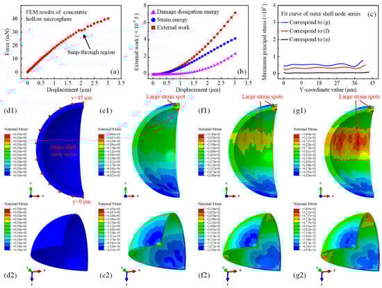 Finite element simulation results of concentric hollow microsphere nanoindentation with prescribed displacement. (a) Force-displacement behavior of the concentric hollow microsphere during uniaxial indentation simulation. (b) The variation of external energy input, strain energy, and damage dissipation energy of the concentric hollow microsphere during uniaxial indentation simulation. (c) The numerical fit curve of the maximum principal stress distributed in the outer shell of the concentric hollow microsphere with respect to the y coordinates at varying displacements. (d–g) The nominal strain distribution of the concentric hollow microsphere during uniaxial indentation simulation. (d1,d2) The nominal strain distribution contour of the concentric hollow microsphere from two different perspectives in the initial configuration. (e1,e2) The nominal strain distribution contour of the concentric hollow microsphere from two different perspectives at a displacement of 1 µm. (f1,f2) The nominal strain distribution contour of the eccentric hollow microsphere from two different perspectives at a displacement of 2 µm. (g1,g2) The nominal strain distribution contour of the eccentric hollow microsphere from two different perspectives at a displacement of 3 µm.