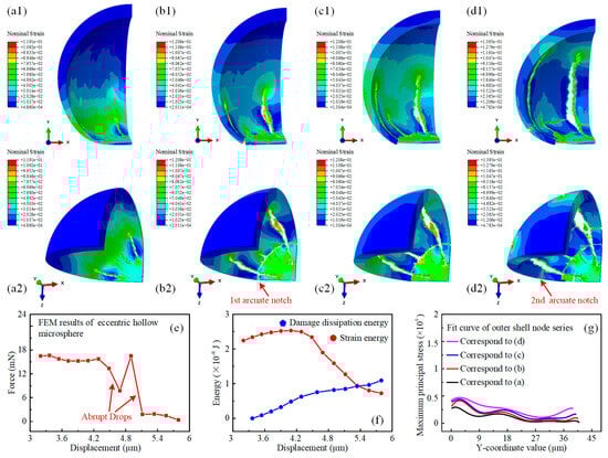 Finite element simulation results of eccentric hollow microsphere nanoindentation with further displacements. (a–d) The nominal strain distribution of the eccentric hollow microsphere during the simulation of further uniaxial indentation. (a1,a2) The nominal strain distribution contour of the eccentric hollow microsphere from two different perspectives at the displacement of 4 µm. (b1,b2) The nominal strain distribution contour of the eccentric hollow microsphere from two different perspectives at the displacement of 4.5 µm. (c1,c2) The nominal strain distribution contour of the eccentric hollow microsphere from two different perspectives at the displacement of 5 µm. (d1,d2) The nominal strain distribution contour of the eccentric hollow microsphere from two different perspectives at the displacement of 5.5 µm. (e) The force-displacement behavior of the eccentric hollow microsphere during simulation of further uniaxial indentation. (f) The variation of strain energy and damage dissipation energy of the eccentric hollow microsphere during the simulation of further uniaxial indentation. (g) The numerical fit curve of the maximum principal stress distributed in the outer shell of the eccentric hollow microsphere with respect to the y coordinates at varying displacements.