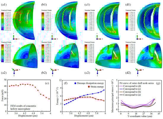 Finite element simulation results of concentric hollow microsphere nanoindentation with further displacements. (a–d) The nominal strain distribution of the concentric hollow microsphere during the simulation of further uniaxial indentation. (a1,a2) The nominal strain distribution contour of the concentric hollow microsphere from two different perspectives at the displacement of 4 µm. (b1,b2) The nominal strain distribution contour of the concentric hollow microsphere from two different perspectives at the displacement of 4.5 µm. (c1,c2) The nominal strain distribution contour of the concentric hollow microsphere from two different perspectives at the displacement of 5 µm. (d1,d2) The nominal strain distribution contour of the concentric hollow microsphere from two different perspectives at the displacement of 6 µm. (e) The force-displacement behavior of the concentric hollow microsphere during simulation of further uniaxial indentation. (f) The variation of strain energy and damage dissipation energy of the concentric hollow microsphere during the simulation of further uniaxial indentation. (g) The numerical fit curve of the maximum principal stress distributed in the outer shell of the concentric hollow microsphere with respect to the y coordinates at varying displacements.