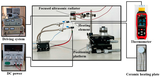 Figure 1 shows the experimental setup to investigate the cooling effect and characteristics of the focused ultrasonic radiator proposed in this work. The experimental system is mainly composed of a focused ultrasonic radiator, a heating element, and two positioning platforms. The focused ultrasonic radiator is driven by an electrical driving system, which consists of a signal generator, an oscilloscope, and a power amplifier. The heating element is a circular ceramic heating plate with a diameter of 5 mm and a thickness of 0.5 mm. The temperature of the heating element is controlled by a DC power supply and measured by a thermometer (TA612C, K-type, Teansi Science and Technology Co., Ltd., Suzhou, China), which is in contact with the heating element surface and can measure the temperature at four points simultaneously. In the experiments, the heating element is located below the radiation face of the focused ultrasonic radiator, which is fixed onto a platform of a XYZ stage (LD60-LM-2, Jutie Precise Machinery Co., Ltd., Shenzhen, China) for adjusting the relative location of the heating element and focused ultrasonic radiator.