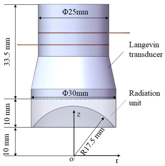 Figure 2 shows the structure and dimensions of the focused ultrasonic radiator, which consists of a Langevin transducer (HNC-4AH-2560, Hainertec Co., Ltd., Suzhou, China) with a first-order resonance frequency of 62.1 kHz, and a radiation unit with a concave radiation face. The radiation unit is made of aluminum and its apparent diameter and height are 30 and 10 mm, respectively. The bottom of the radiation unit is bonded onto the end face of the Langevin transducer with epoxy resin adhesive. The concave radiation face is fabricated using the grinding process, and the radius of the concave radiation face is 17.5 mm. Due to the mass effect of the radiation unit, the first-order resonant frequency of the whole ultrasonic transducer decreases to 55.1 kHz (measured using a laser Doppler vibrometer PSV-500, POLYTEC).